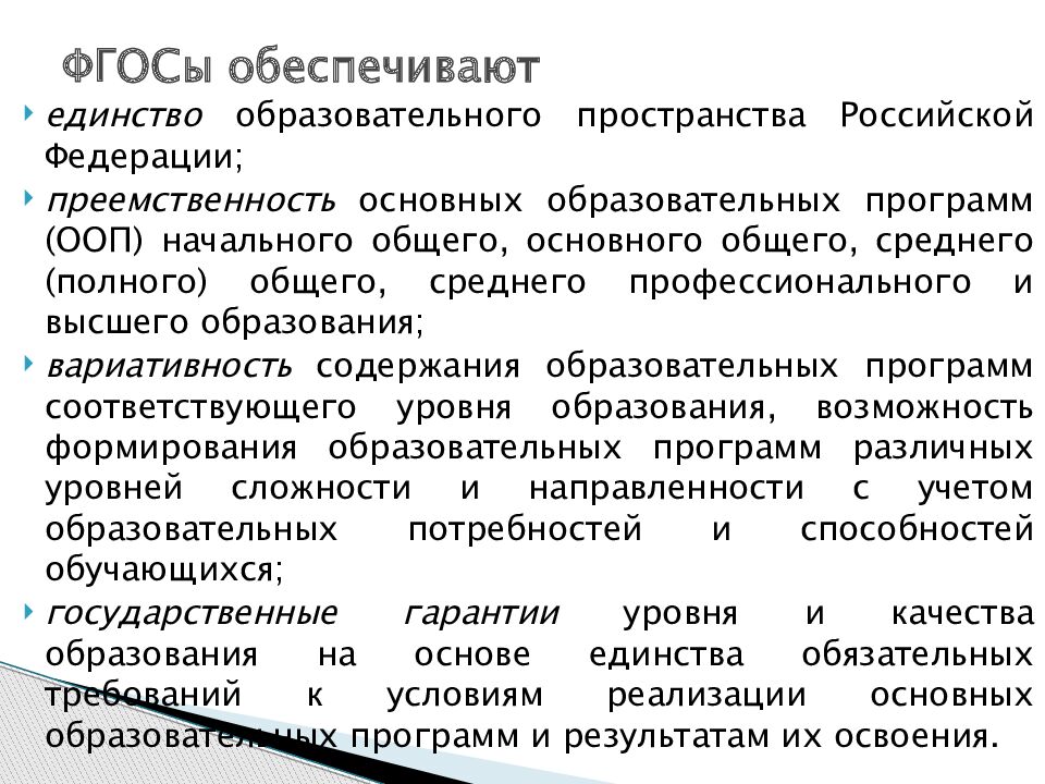 единство образовательного пространства Российской Федерации; преемственность основных образовательных программ (ООП) начального общего, основного общего, среднего (полного) общего, среднего профессионального и высшего образования; вариативность содержания образовательных программ соответствующего уровня образования, возможность формирования образовательных программ различных уровней сложности и направленности с учетом образовательных потребностей и способностей обучающихся ; государственные гарантии уровня и качества образования на основе единства обязательных требований к условиям реализации основных образовательных программ и результатам их освоения. ФГОСы обеспечивают
