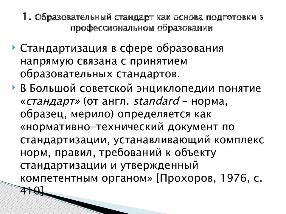 Стандартизация в сфере образования напрямую связана с принятием образовательных стандартов. В Большой советской энциклопедии понятие « стандарт» (от англ. standard – норма, образец, мерило) определяется как « нормативно-технический документ по стандартизации, устанавливающий комплекс норм, правил, требований к объекту стандартизации и утвержденный компетентным органом» [Прохоров, 1976, с. 410]. 1. Образовательный стандарт как основа подготовки в профессиональном образовании