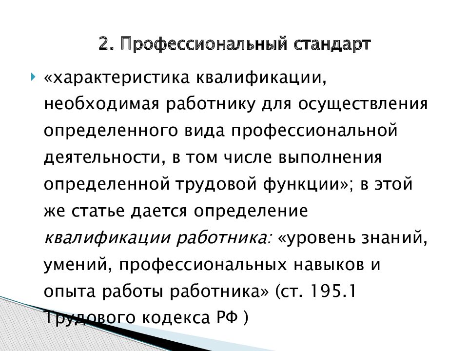 «характеристика квалификации, необходимая работнику для осуществления определенного вида профессиональной деятельности, в том числе выполнения определенной трудовой функции»; в этой же статье дается определение квалификации работника: «уровень знаний, умений, профессиональных навыков и опыта работы работника» ( ст. 195.1 Трудового кодекса РФ ) 2. Профессиональный стандарт