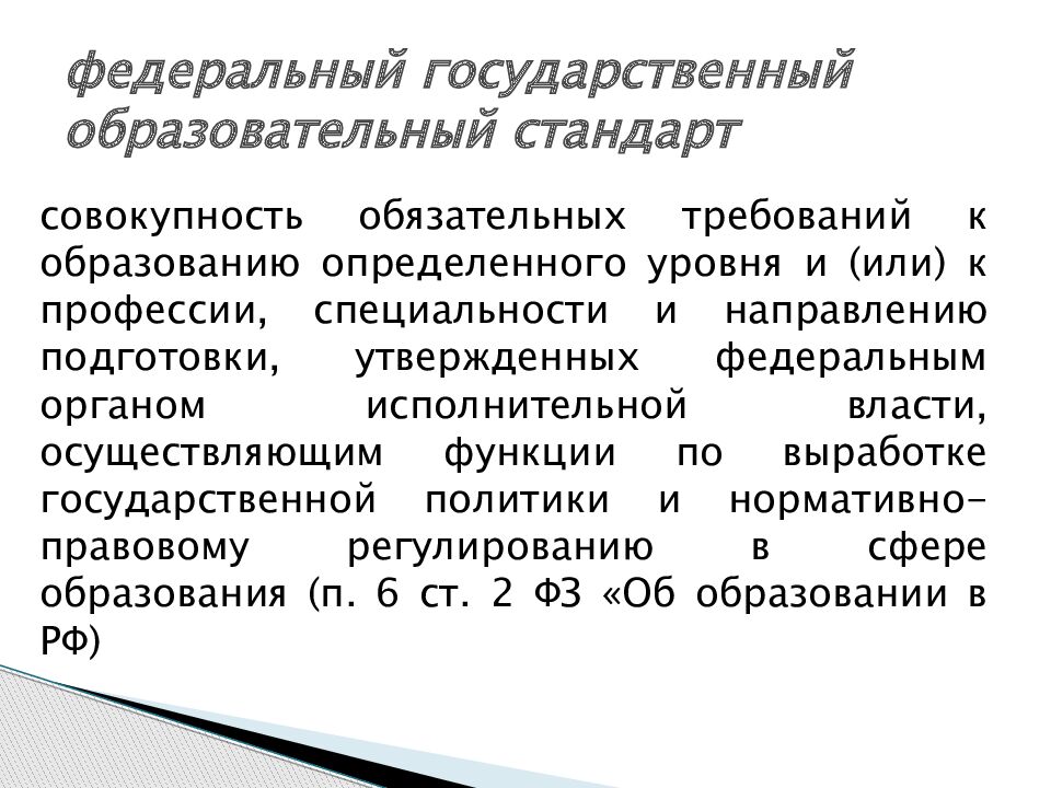 совокупность обязательных требований к образованию определенного уровня и (или) к профессии, специальности и направлению подготовки, утвержденных федеральным органом исполнительной власти, осуществляющим функции по выработке государственной политики и нормативно-правовому регулированию в сфере образования (п. 6 ст. 2 ФЗ «Об образовании в РФ) федеральный государственный образовательный стандарт