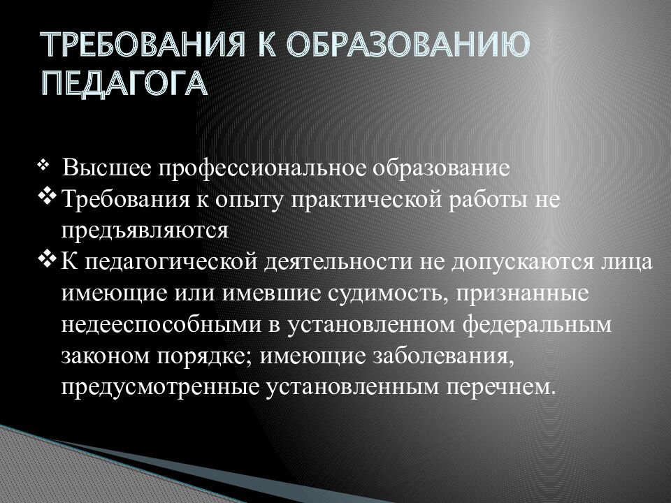 Высшее профессиональное образование Требования к опыту практической работы не предъявляются К педагогической деятельности не допускаются лица имеющие или имевшие судимость, признанные недееспособными в установленном федеральным законом порядке; имеющие заболевания, предусмотренные установленным перечнем.