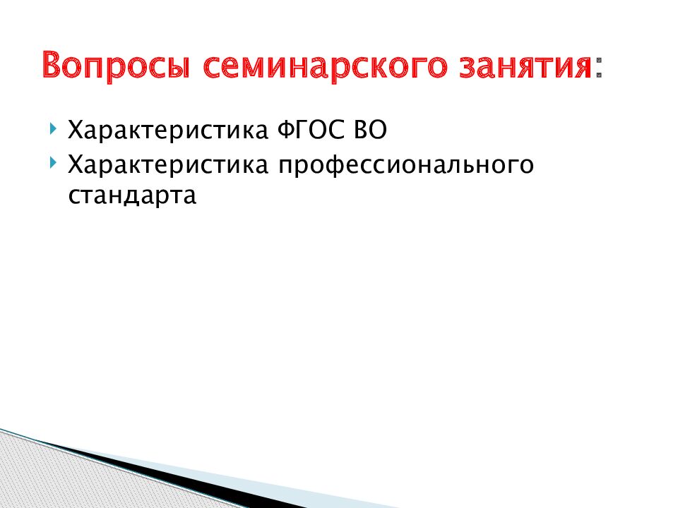 Характеристика ФГОС ВО Характеристика профессионального стандарта Вопросы семинарского занятия :