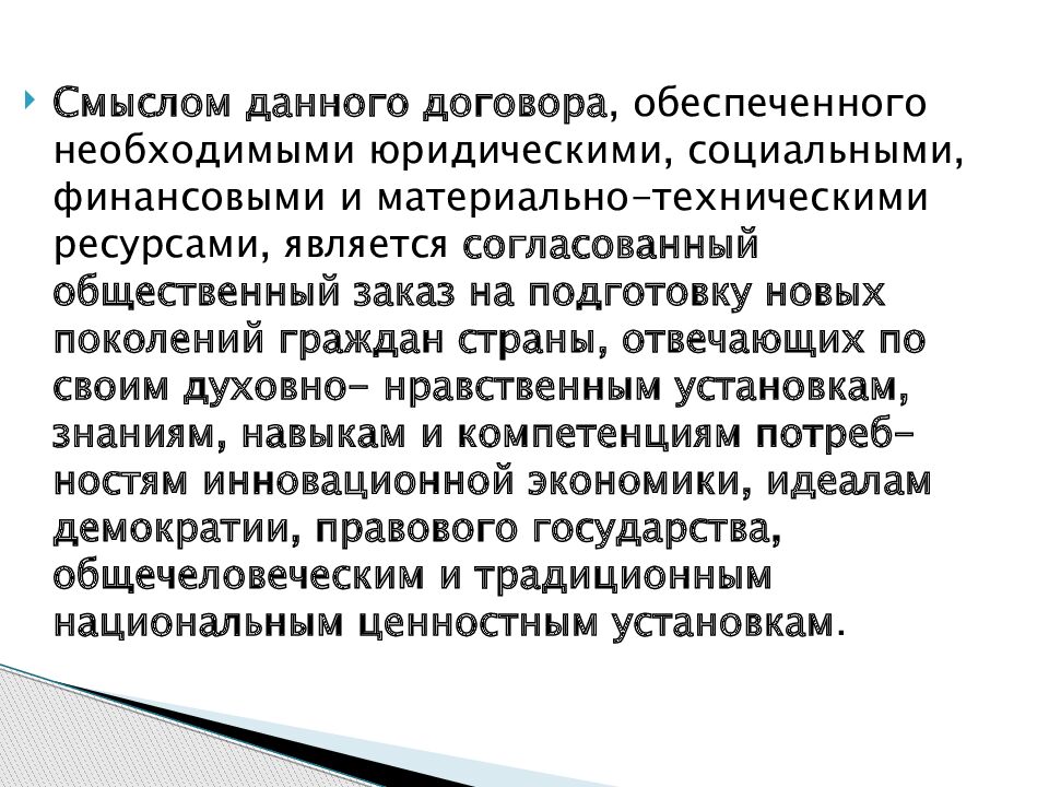 Смыслом данного договора, обеспеченного необходимыми юридическими, социальными, финансовыми и материально-техническими ресурсами, является согласованный общественный заказ на подготовку новых поколений граждан страны, отвечающих по своим духовно- нравственным установкам, знаниям, навыкам и компетенциям потреб- ностям инновационной экономики, идеалам демократии, правового государства, общечеловеческим и традиционным национальным ценностным установкам.