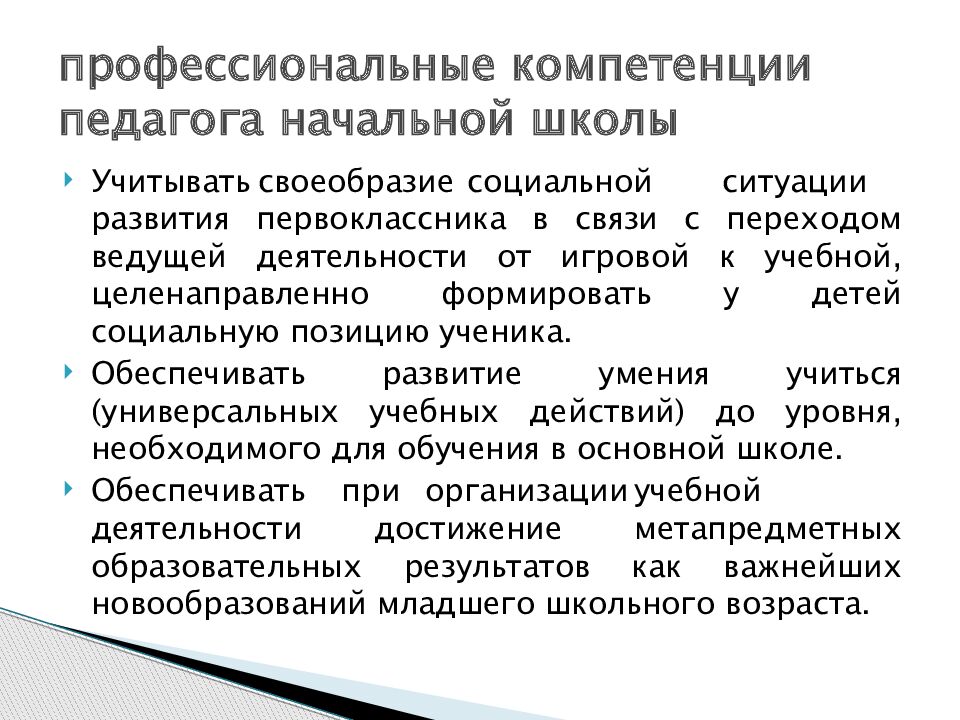 Учитывать своеобразие социальной ситуации развития первоклассника в связи с переходом ведущей деятельности от игровой к учебной, целенаправленно формировать у детей социальную позицию ученика. Обеспечивать развитие умения учиться (универсальных учебных действий) до уровня, необходимого для обучения в основной школе. Обеспечивать при организации учебной деятельности достижение метапредметных образовательных результатов как важнейших новообразований младшего школьного возраста. профессиональные компетенции педагога начальной школы