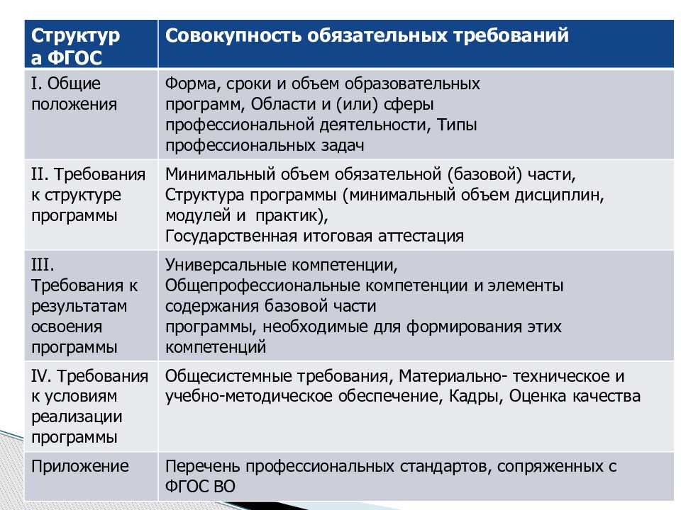 Структура ФГОС Совокупность обязательных требований I. Общие положения Форма, сроки и объем образовательных программ, Области и (или) сферы профессиональной деятельности, Типы профессиональных задач II. Требования к структуре программы Минимальный объем обязательной (базовой) части, Структура программы (минимальный объем дисциплин, модулей и практик), Государственная итоговая аттестация III. Требования к результатам освоения программы Универсальные компетенции, Общепрофессиональные компетенции и элементы содержания базовой части программы, необходимые для формирования этих компетенций IV. Требования к условиям реализации программы Общесистемные требования, Материально- техническое и учебно-методическое обеспечение, Кадры, Оценка качества Приложение Перечень профессиональных стандартов, сопряженных с ФГОС ВО