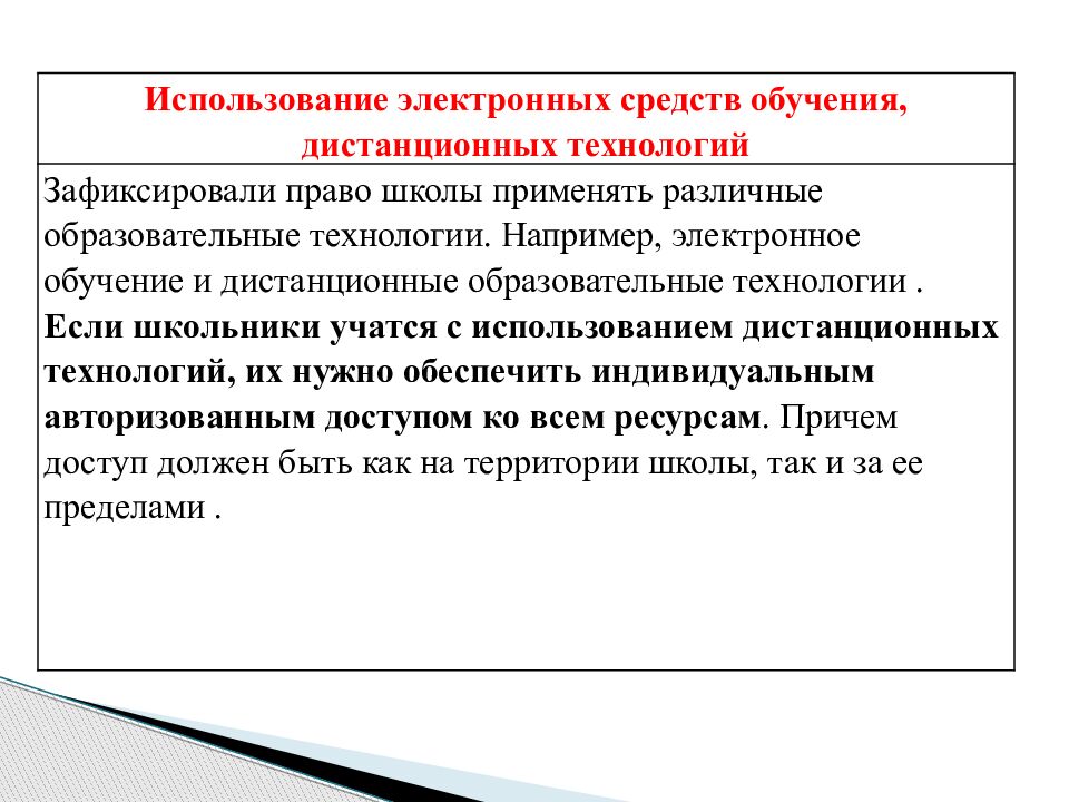 Использование электронных средств обучения, дистанционных технологий Зафиксировали право школы применять различные образовательные технологии. Например, электронное обучение и дистанционные образовательные технологии. Если школьники учатся с использованием дистанционных технологий, их нужно обеспечить индивидуальным авторизованным доступом ко всем ресурсам. Причем доступ должен быть как на территории школы, так и за ее пределами.