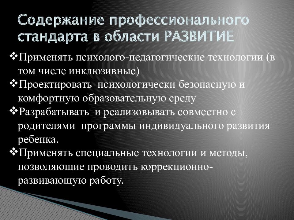 Применять психолого-педагогические технологии (в том числе инклюзивные) Проектировать психологически безопасную и комфортную образовательную среду Разрабатывать и реализовывать совместно с родителями программы индивидуального развития ребенка. Применять специальные технологии и методы, позволяющие проводить коррекционно-развивающую работу.