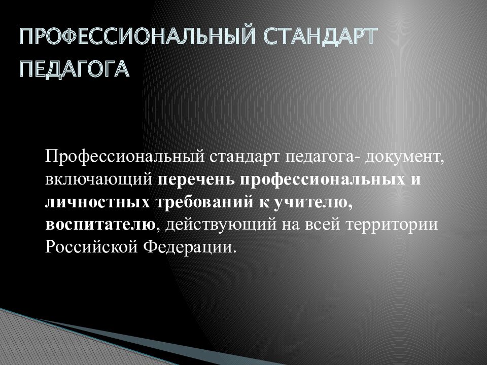 Профессиональный стандарт педагога- документ, включающий перечень профессиональных и личностных требований к учителю, воспитателю, действующий на всей территории Российской Федерации.