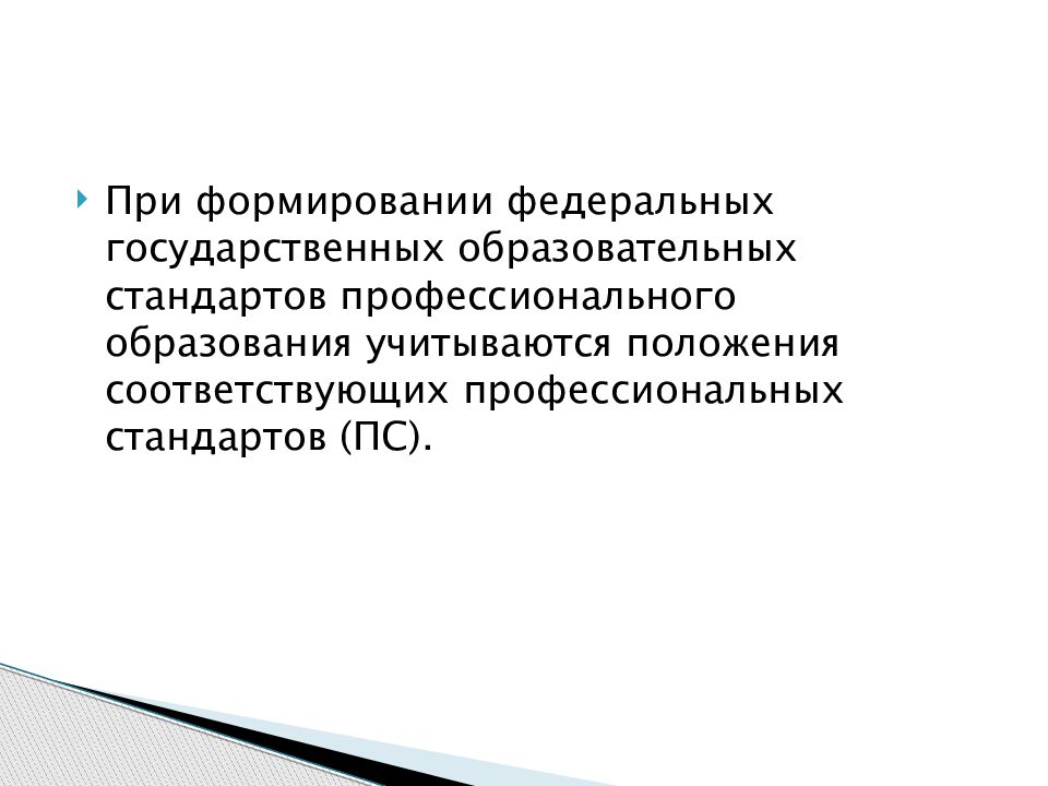 При формировании федеральных государственных образовательных стандартов профессионального образования учитываются положения соответствующих профессиональных стандартов (ПС).