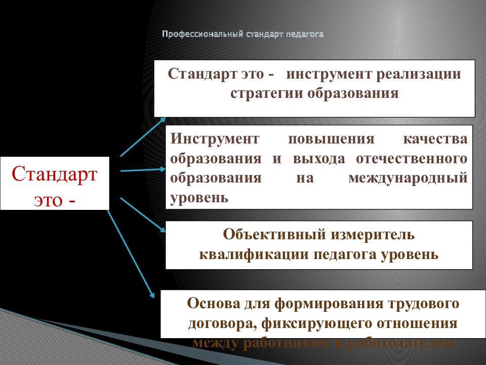 Стандарт это - Стандарт это - инструмент реализации стратегии образования Инструмент повышения качества образования и выхода отечественного образования на международный уровень Объективный измеритель квалификации педагога уровень Основа для формирования трудового договора, фиксирующего отношения между работником и работодателем