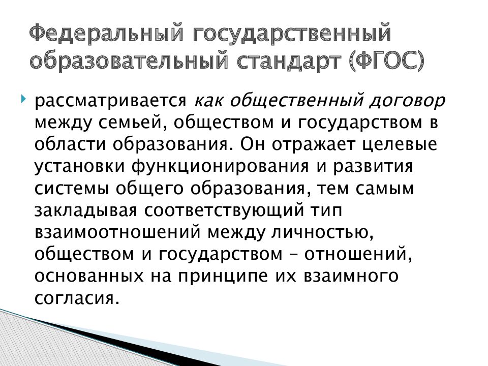 рассматривается как общественный договор между семьей, обществом и государством в области образования. Он отражает целевые установки функционирования и развития системы общего образования, тем самым закладывая соответствующий тип взаимоотношений между личностью, обществом и государством – отношений, основанных на принципе их взаимного согласия. Федеральный государственный образовательный стандарт (ФГОС)