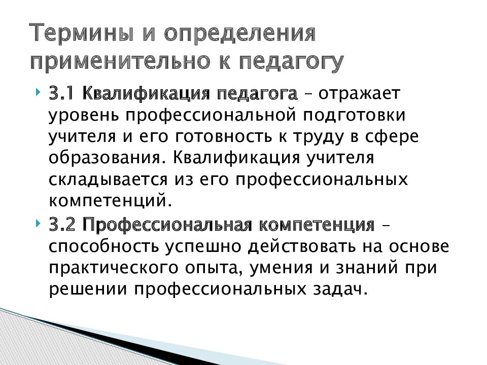 3.1 Квалификация педагога – отражает уровень профессиональной подготовки учителя и его готовность к труду в сфере образования. Квалификация учителя складывается из его профессиональных компетенций. 3.2 Профессиональная компетенция – способность успешно действовать на основе практического опыта, умения и знаний при решении профессиональных задач. Термины и определения применительно к педагогу