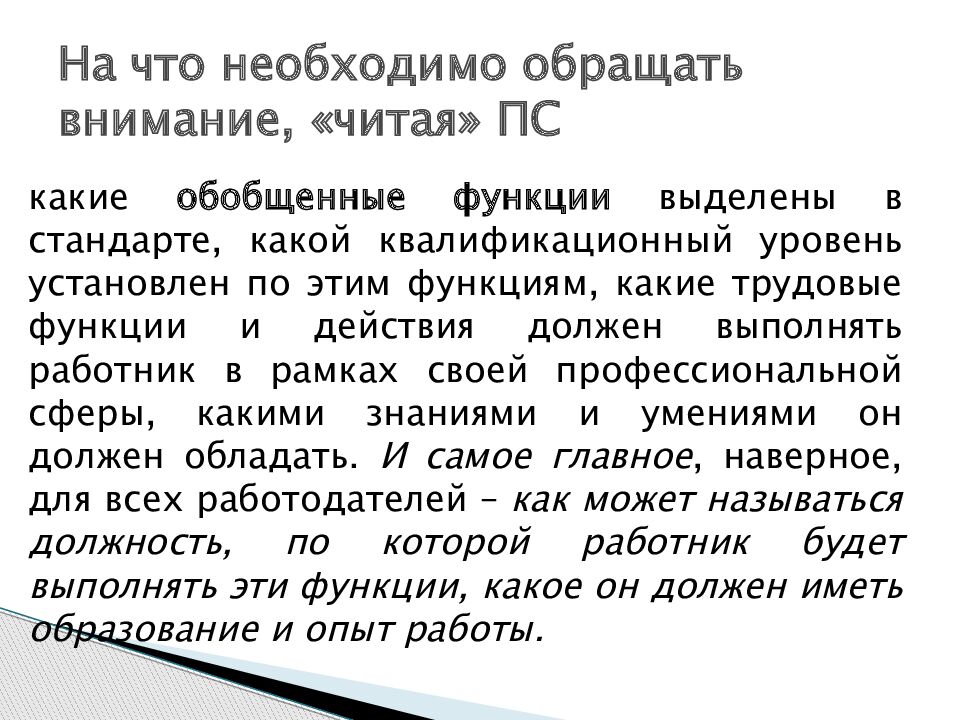 какие обобщенные функции выделены в стандарте, какой квалификационный уровень установлен по этим функциям, какие трудовые функции и действия должен выполнять работник в рамках своей профессиональной сферы, какими знаниями и умениями он должен обладать. И самое главное, наверное, для всех работодателей – как может называться должность, по которой работник будет выполнять эти функции, какое он должен иметь образование и опыт работы. На что необходимо обращать внимание, «читая» ПС