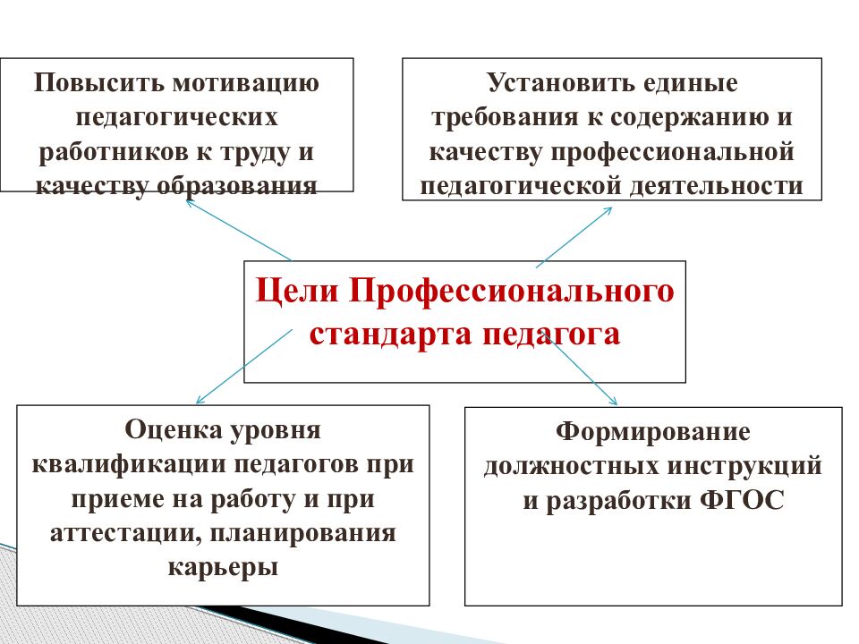 Повысить мотивацию педагогических работников к труду и качеству образования Установить единые требования к содержанию и качеству профессиональной педагогической деятельности Оценка уровня квалификации педагогов при приеме на работу и при аттестации, планирования карьеры Формирование должностных инструкций и разработки ФГОС Цели Профессионального стандарта педагога
