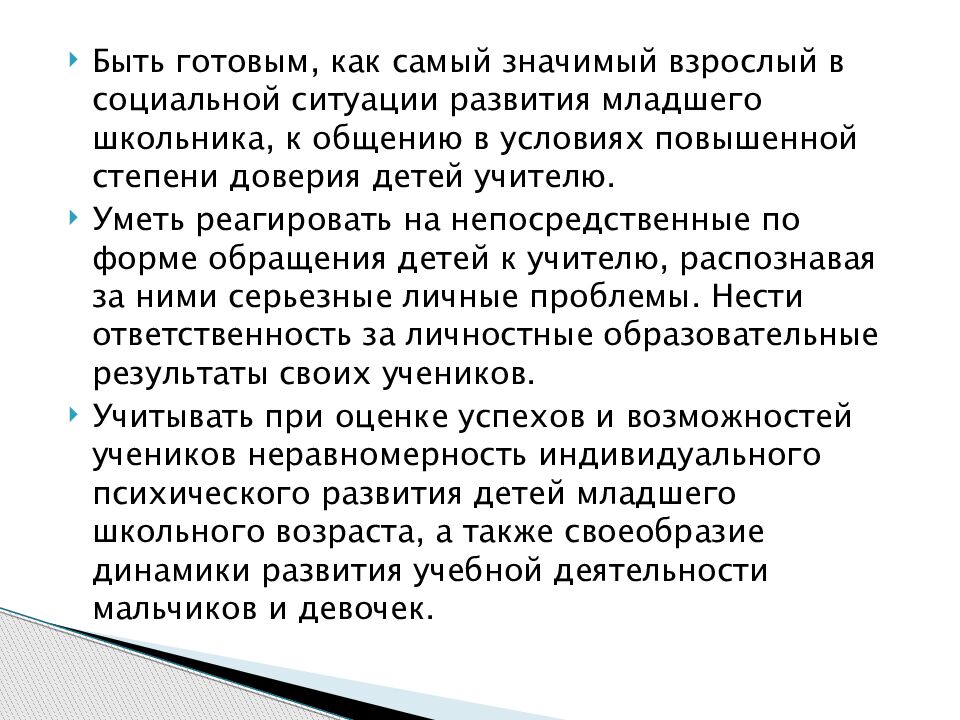 Быть готовым, как самый значимый взрослый в социальной ситуации развития младшего школьника, к общению в условиях повышенной степени доверия детей учителю. Уметь реагировать на непосредственные по форме обращения детей к учителю, распознавая за ними серьезные личные проблемы. Нести ответственность за личностные образовательные результаты своих учеников. Учитывать при оценке успехов и возможностей учеников неравномерность индивидуального психического развития детей младшего школьного возраста, а также своеобразие динамики развития учебной деятельности мальчиков и девочек.