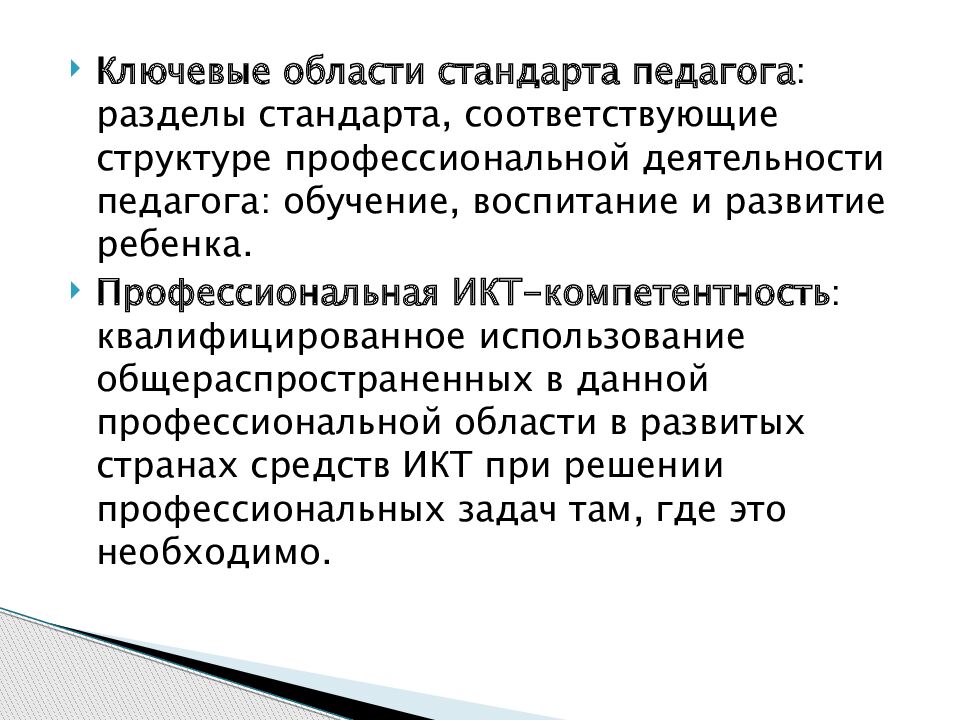 Ключевые области стандарта педагога : разделы стандарта, соответствующие структуре профессиональной деятельности педагога: обучение, воспитание и развитие ребенка. Профессиональная ИКТ-компетентность : квалифицированное использование общераспространенных в данной профессиональной области в развитых странах средств ИКТ при решении профессиональных задач там, где это необходимо.