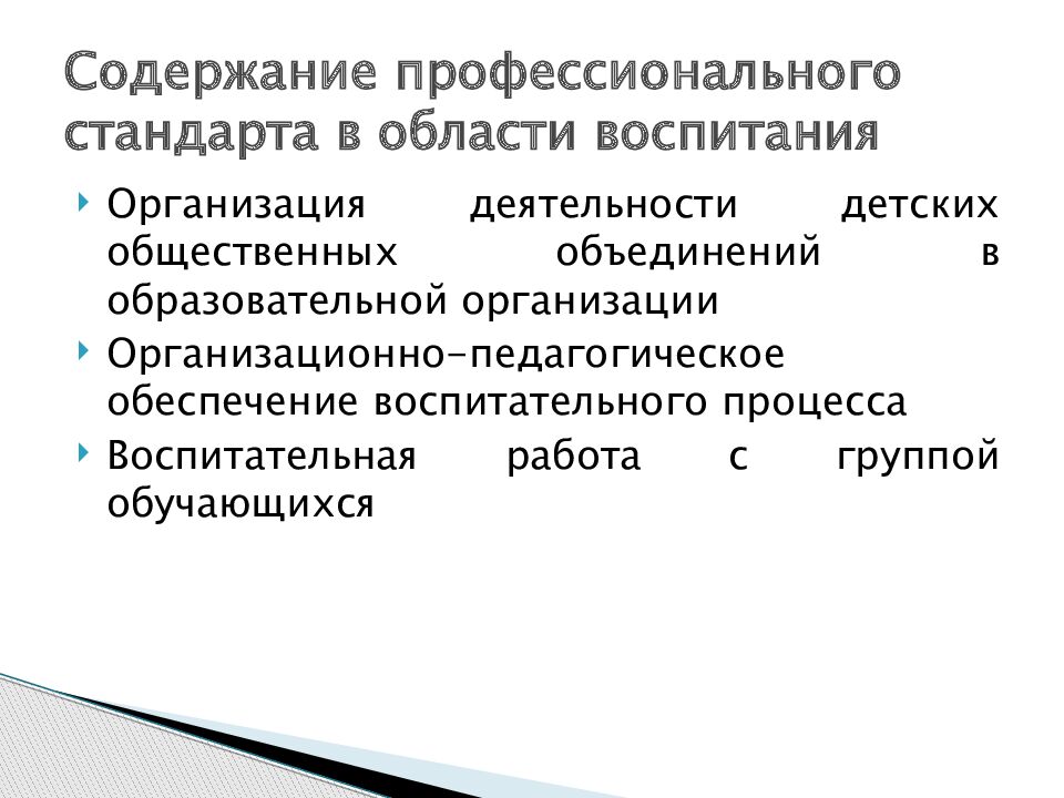 Организация деятельности детских общественных объединений в образовательной организации Организационно-педагогическое обеспечение воспитательного процесса Воспитательная работа с группой обучающихся Содержание профессионального стандарта в области воспитания