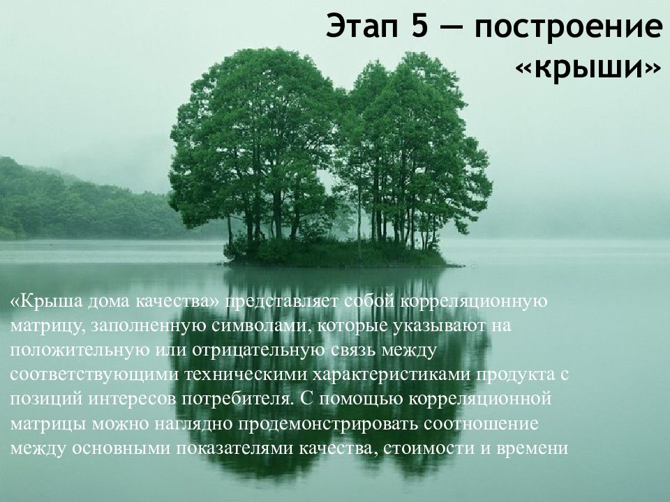 «Крыша дома качества» представляет собой корреляционную матрицу, заполненную символами, которые указывают на положительную или отрицательную связь между соответствующими техническими характеристиками продукта с позиций интересов потребителя. С помощью корреляционной матрицы можно наглядно продемонстрировать соотношение между основными показателями качества, стоимости и времени