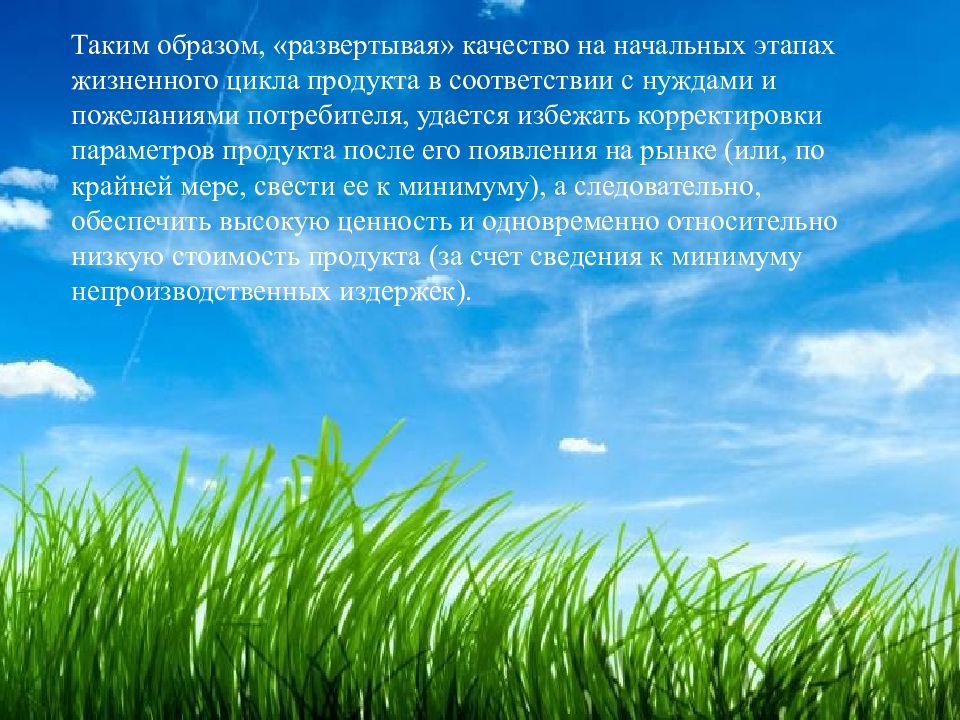 Таким образом, «развертывая» качество на начальных этапах жизненного цикла продукта в соответствии с нуждами и пожеланиями потребителя, удается избежать корректировки параметров продукта после его появления на рынке (или, по крайней мере, свести ее к минимуму), а следовательно, обеспечить высокую ценность и одновременно относительно низкую стоимость продукта (за счет сведения к минимуму непроизводственных издержек).