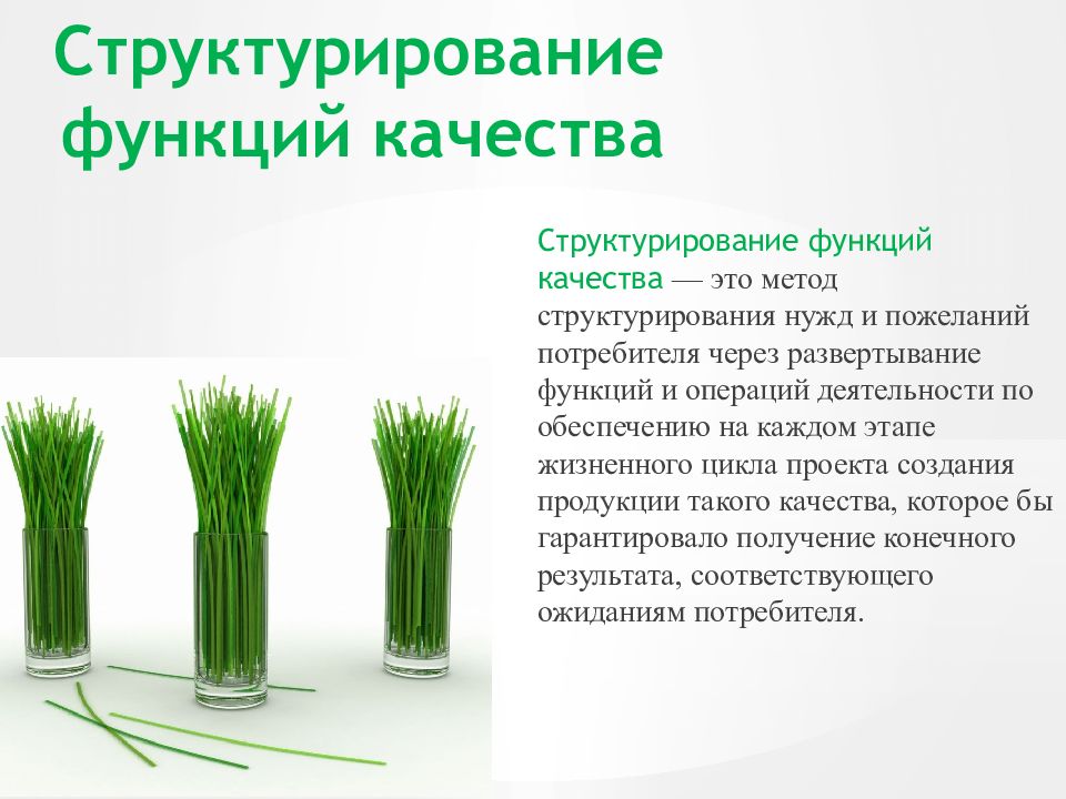 Структурирование функций качества — это метод структурирования нужд и пожеланий потребителя через развертывание функций и операций деятельности по обеспечению на каждом этапе жизненного цикла проекта создания продукции такого качества, которое бы гарантировало получение конечного результата, соответствующего ожиданиям потребителя.