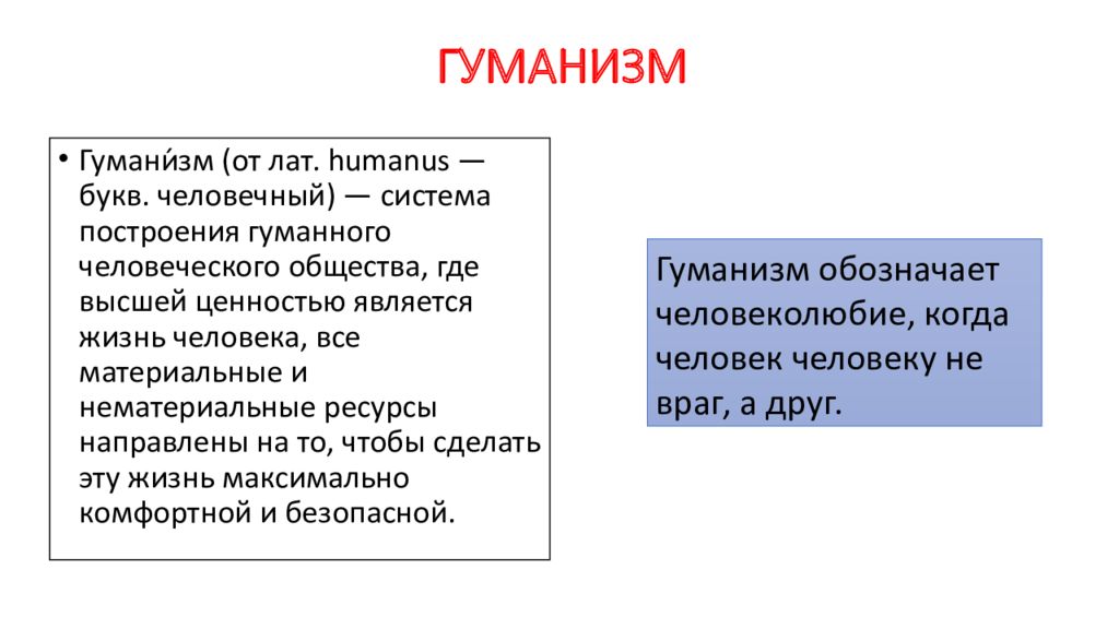 Гумани́зм (от лат. humanus — букв. человечный) — система построения гуманного человеческого общества, где высшей ценностью является жизнь человека, все материальные и нематериальные ресурсы направлены на то, чтобы сделать эту жизнь максимально комфортной и безопасной. Гуманизм обозначает человеколюбие, когда человек человеку не враг, а друг.