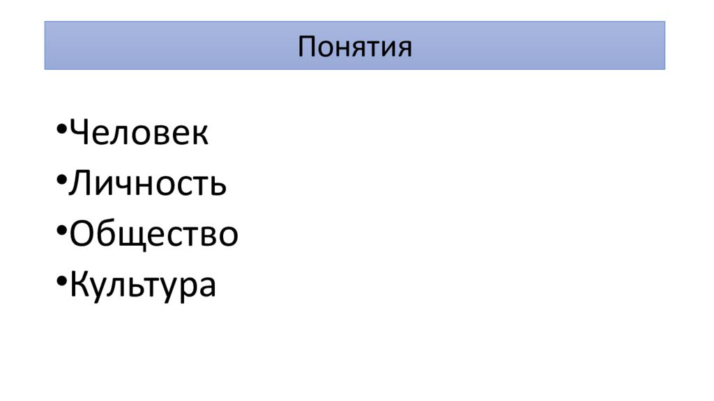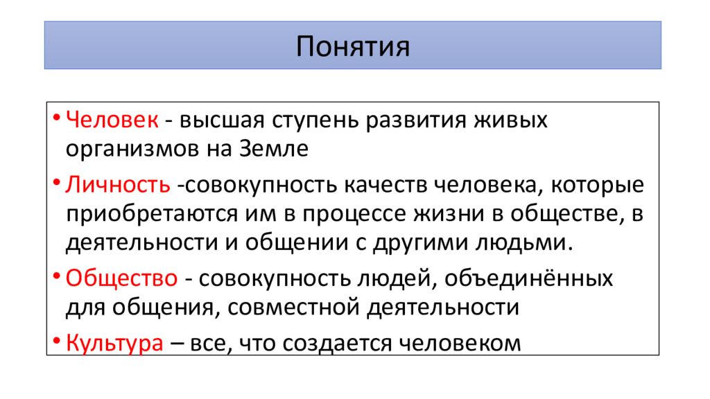 Человек - высшая ступень развития живых организмов на Земле Личность -совокупность качеств человека, которые приобретаются им в процессе жизни в обществе, в деятельности и общении с другими людьми. Общество - совокупность людей, объединённых для общения, совместной деятельности Культура – все, что создается человеком