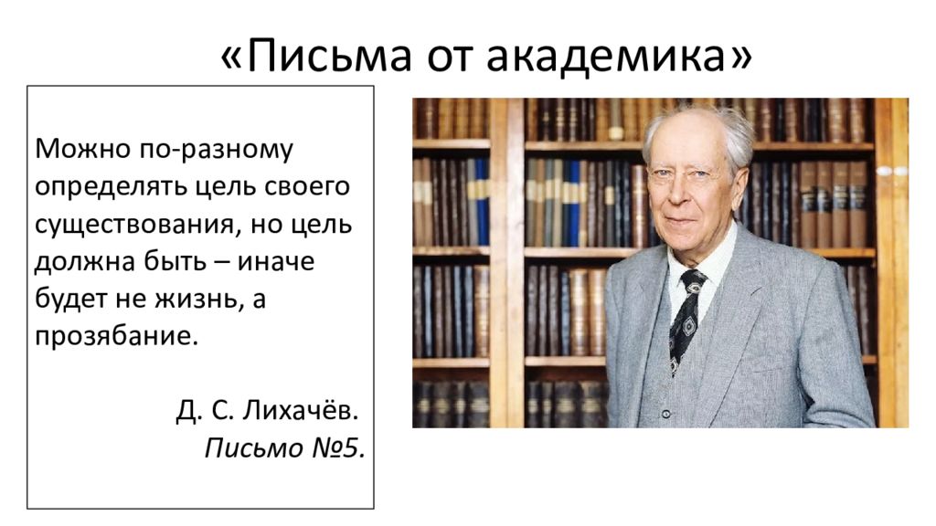 Можно по-разному определять цель своего существования, но цель должна быть – иначе будет не жизнь, а прозябание. Д. С. Лихачёв. Письмо №5. «Письма от академика»