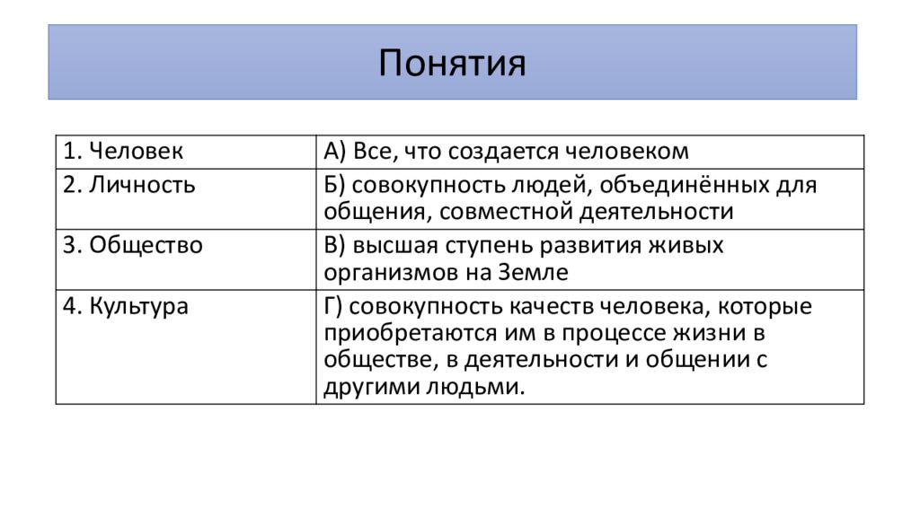 1. Человек А) Все, что создается человеком 2. Личность Б) совокупность людей, объединённых для общения, совместной деятельности 3. Общество В) высшая ступень развития живых организмов на Земле 4. Культура Г) совокупность качеств человека, которые приобретаются им в процессе жизни в обществе, в деятельности и общении с другими людьми.