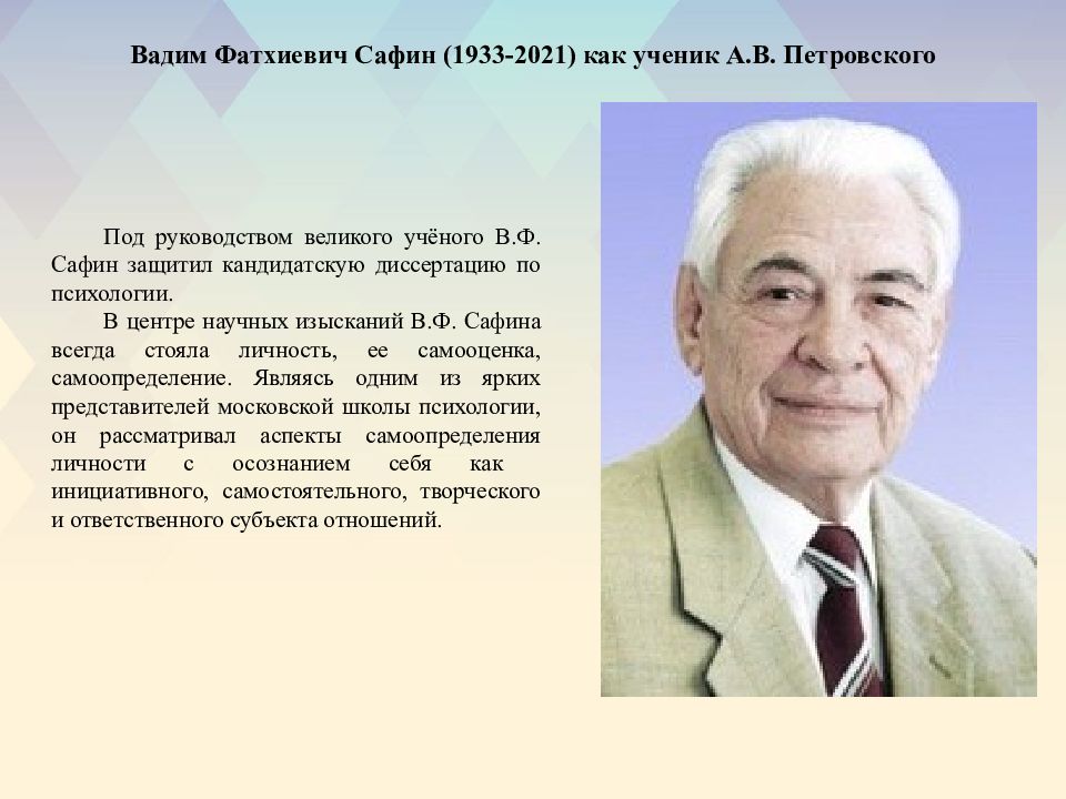 Слайд 6: Вадим Фатхиевич Сафин (1933-2021) как ученик А.В. Петровского