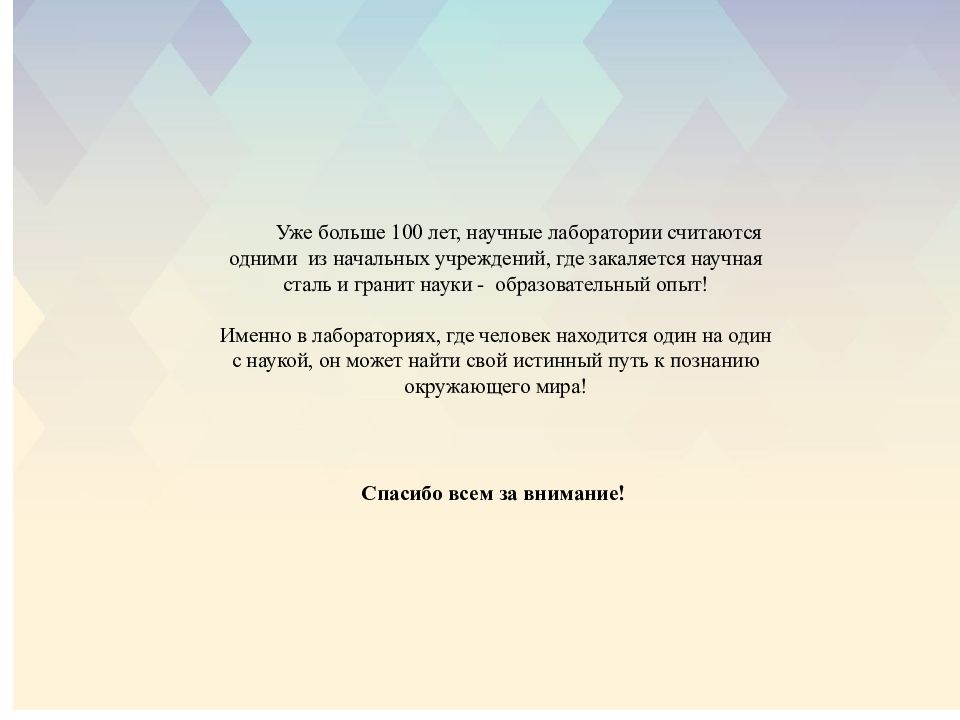 Последний слайд презентации: Донецкий государственный университет Биологический факультет Кафедра общей: Уже больше 100 лет, научные лаборатории считаются одними из начальных учреждений, где закаляется научная сталь и гранит науки - образовательный опыт ! Именно в лабораториях, где человек находится один на один с наукой, он может найти свой истинный путь к познанию окружающего мира!