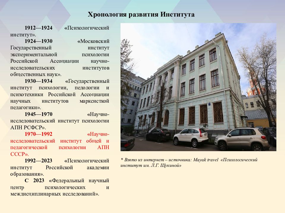 1912—1924 « Психологический институт». 1924—1930 « Московский Государственный институт экспериментальной психологии Российской Ассоциации научно-исследовательских институтов общественных наук». 1930—1934 « Государственный институт психологии, педологии и психотехники Российской Ассоциации научных институтов марксисткой педагогики». 1945—1970 « Научно-исследовательский институт психологии АПН РСФСР». 1970—1992 « Научно-исследовательский институт общей и педагогической психологии АПН СССР». 1992—2023 « Психологический институт Российской академии образования». С 2023 « Федеральный научный центр психологических и междисциплинарных исследований». * В зято из интернет – источника: Mayak travel «Психологический институт им. Л.Г. Щукиной»