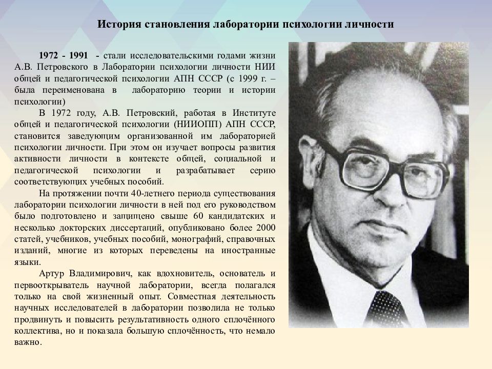 1972 - 1991 - стали исследовательскими годами жизни А.В. Петровского в Лаборатории психологии личности НИИ общей и педагогической психологии АПН СССР (с 1999 г. – была переименована в лабораторию теории и истории психологии ) В 1972 году, А.В. Петровский, работая в Институте общей и педагогической психологии (НИИОПП) АПН СССР, становится заведующим организованной им лабораторией психологии личности. При этом он изучает вопросы развития активности личности в контексте общей, социальной и педагогической психологии и разрабатывает серию соответствующих учебных пособий. На протяжении почти 40-летнего периода существования лаборатории психологии личности в ней под его руководством было подготовлено и защищено свыше 60 кандидатских и несколько докторских диссертаций, опубликовано более 2000 статей, учебников, учебных пособий, монографий, справочных изданий, многие из которых переведены на иностранные языки. Артур Владимирович, как вдохновитель, основатель и первооткрыватель научной лаборатории, всегда полагался только на свой жизненный опыт. Совместная деятельность научных исследователей в лаборатории позволила не только продвинуть и повысить результативность одного сплочённого коллектива, но и показала большую сплочённость, что немало важно.