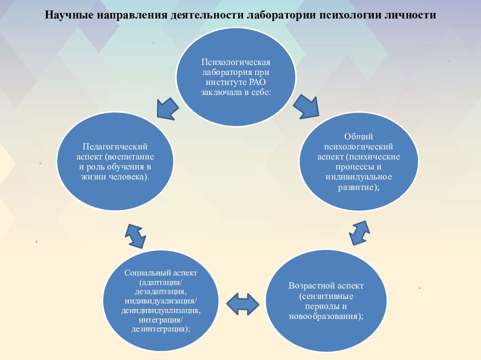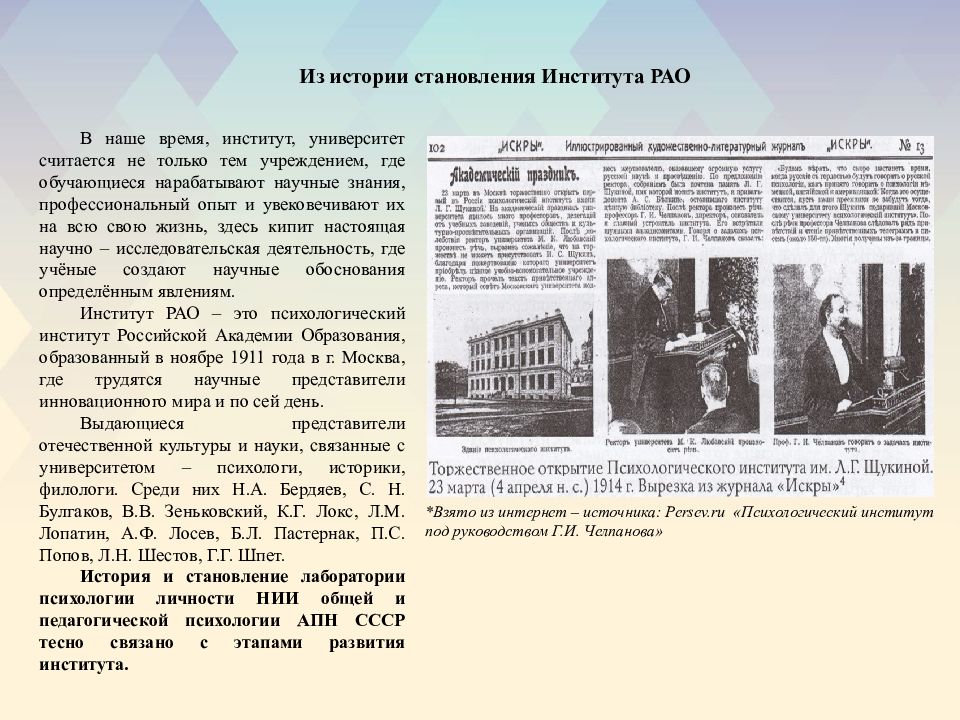 В наше время, институт, университет считается не только тем учреждением, где обучающиеся нарабатывают научные знания, профессиональный опыт и увековечивают их на всю свою жизнь, здесь кипит настоящая научно – исследовательская деятельность, где учёные создают научные обоснования определённым явлениям. Институт РАО – это психологический институт Российской Академии Образования, образованный в ноябре 1911 года в г. Москва, где трудятся научные представители инновационного мира и по сей день. Выдающиеся представители отечественной культуры и науки, связанные с университетом – психологи, историки, филологи. Среди них Н.А. Бердяев, С. Н. Булгаков, В.В. Зеньковский, К.Г. Локс, Л.М. Лопатин, А.Ф. Лосев, Б.Л. Пастернак, П.С. Попов, Л.Н. Шестов, Г.Г. Шпет. История и становление лаборатории психологии личности НИИ общей и педагогической психологии АПН СССР тесно связано с этапами развития института. * В зято из интернет – источника: Persev.ru «Психологический институт под руководством Г.И. Челпанова»