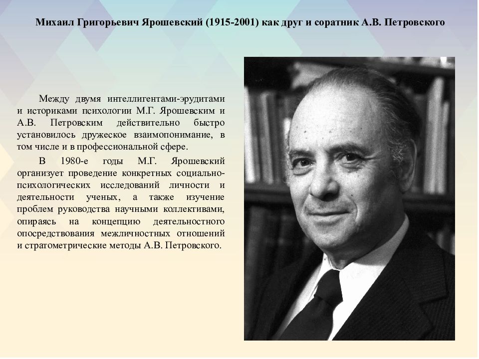 Между двумя интеллигентами-эрудитами и историками психологии М.Г. Ярошевским и А.В. Петровским действительно быстро установилось дружеское взаимопонимание, в том числе и в профессиональной сфере. В 1980-е годы М.Г. Ярошевский организует проведение конкретных социально-психологических исследований личности и деятельности ученых, а также изучение проблем руководства научными коллективами, опираясь на концепцию деятельностного опосредствования межличностных отношений и стратометрические методы А.В. Петровского.