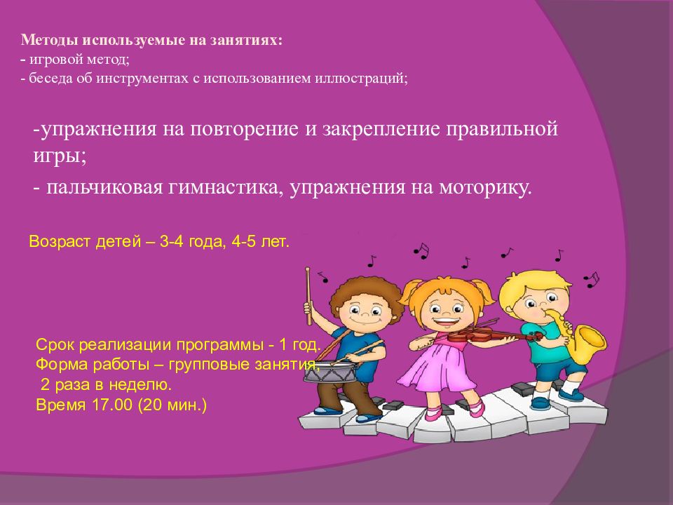 -упражнения на повторение и закрепление правильной игры ; - пальчиковая гимнастика, упражнения на моторику. Возраст детей – 3-4 года, 4-5 лет. Срок реализации программы - 1 год. Форма работы – групповые занятия, 2 раза в неделю. Время 17.00 (20 мин.)