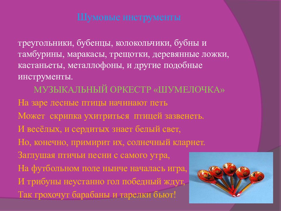 треугольники, бубенцы, колокольчики, бубны и тамбурины, маракасы, трещотки, деревянные ложки, кастаньеты, металлофоны, и другие подобные инструменты. МУЗЫКАЛЬНЫЙ ОРКЕСТР «ШУМЕЛОЧКА» На заре лесные птицы начинают петь Может скрипка ухитриться птицей зазвенеть. И весёлых, и сердитых знает белый свет, Но, конечно, примирит их, солнечный кларнет. Заглушая птичьи песни с самого утра, На футбольном поле нынче началась игра, И трибуны неустанно гол победный ждут, Так грохочут барабаны и тарелки бьют!