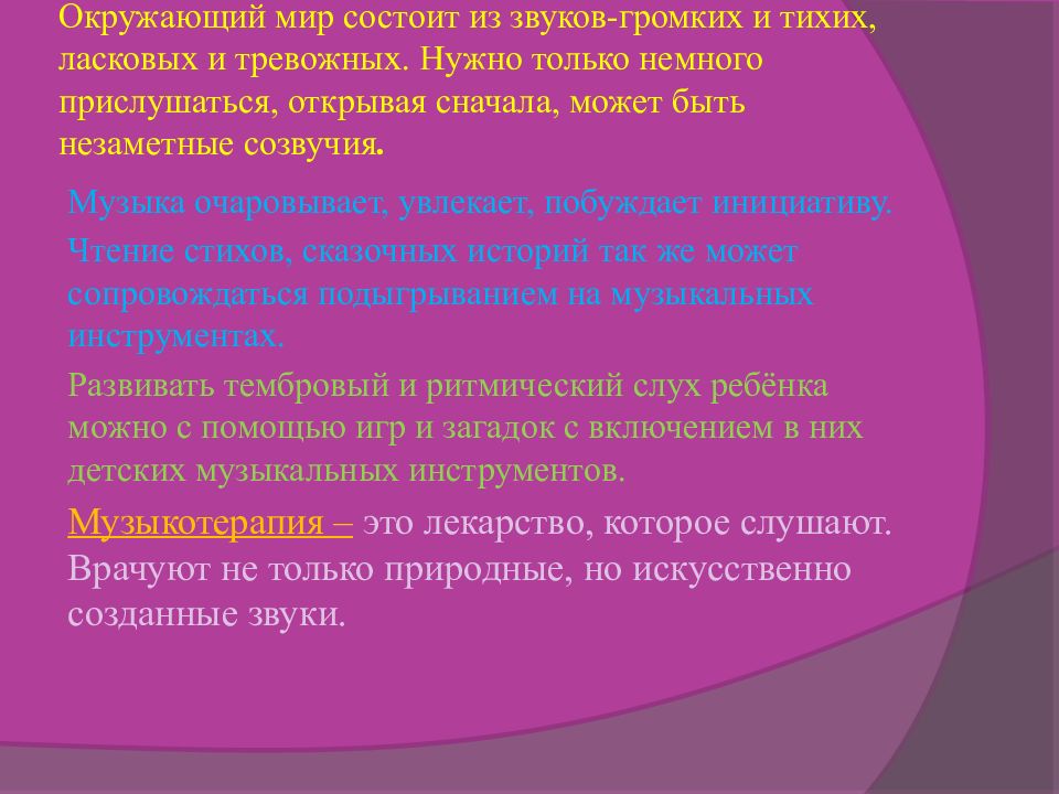 Музыка очаровывает, увлекает, побуждает инициативу. Чтение стихов, сказочных историй так же может сопровождаться подыгрыванием на музыкальных инструментах. Развивать тембровый и ритмический слух ребёнка можно с помощью игр и загадок с включением в них детских музыкальных инструментов. Музыкотерапия – это лекарство, которое слушают. Врачуют не только природные, но искусственно созданные звуки.