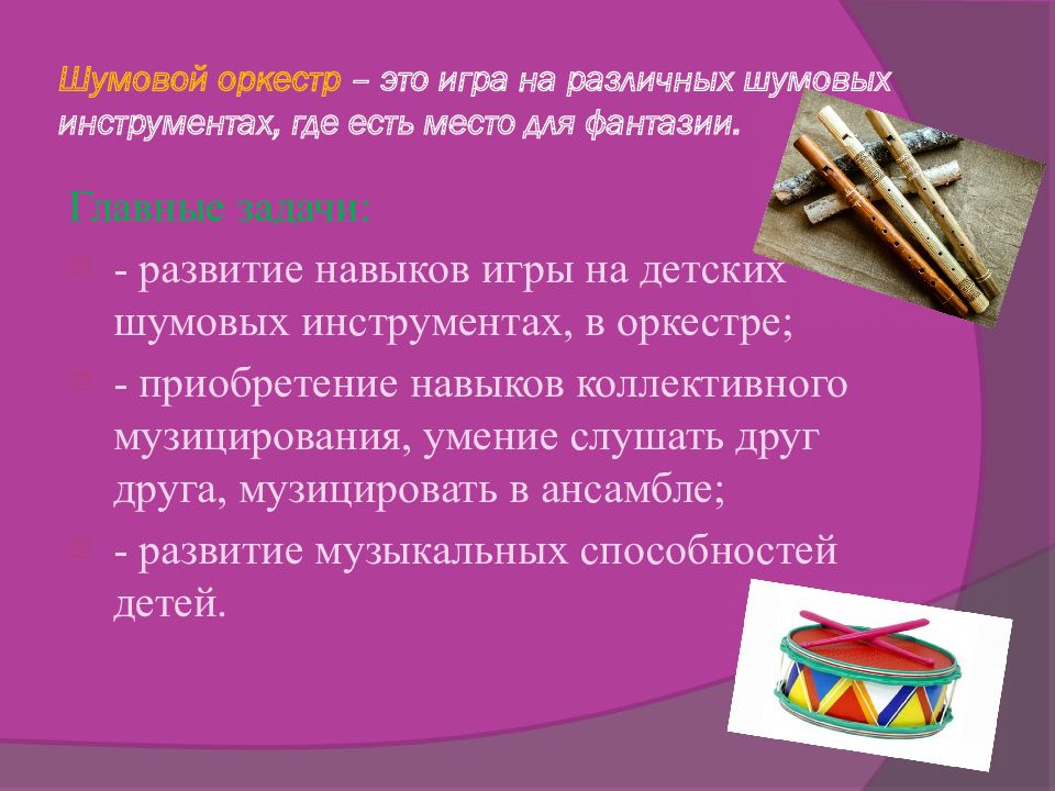 Главные задачи : - развитие навыков игры на детских шумовых инструментах, в оркестре; - приобретение навыков коллективного музицирования, умение слушать друг друга, музицировать в ансамбле; - развитие музыкальных способностей детей.