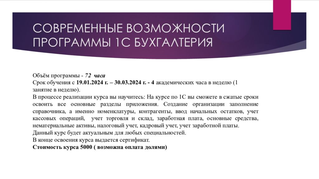 Объём программы - 72 часа Срок обучения с 19.01.2024 г. – 30.03.2024 г. - 4 академических часа в неделю (1 занятие в неделю). В процессе реализации курса вы научитесь: На курсе по 1С вы сможете в сжатые сроки освоить все основные разделы приложения. Создание организации заполнение справочника, а именно номенклатуры, контрагенты, ввод начальных остатков, учет кассовых операций, учет торговля и склад, заработная плата, основные средства, нематериальные активы, налоговый учет, кадровый учет, учет заработной платы. Данный курс будет актуальным для любых специальностей. В конце освоения курса выдается сертификат. Стоимость курса 5000 ( возможна оплата долями)