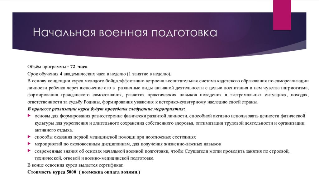 Объём программы - 72 часа Срок обучения 4 академических часа в неделю (1 занятие в неделю). В основу концепции курса молодого бойца эффективно встроена воспитательная система кадетского образования по самореализации личности ребенка через включение его в различные виды активной деятельности с целью воспитания в нем чувства патриотизма, формирования гражданского самосознания, развития практических навыков поведения в экстремальных ситуациях, походах, ответственности за судьбу Родины, формирования уважения к историко-культурному наследию своей страны. В процессе реализации курса будут проведены следующие мероприятия: основы для формирования разносторонне физически развитой личности, способной активно использовать ценности физической культуры для укрепления и длительного сохранения собственного здоровья, оптимизации трудовой деятельности и организации активного отдыха. способы оказания первой медицинской помощи при неотложных состояниях мероприятий по околовоенным дисциплинам, для получения жизненно-важных навыков современные знания об основах начальной военной подготовки, чтобы Слушатели могли проводить занятия по строевой, технической, огневой и военно-медицинской подготовке. В конце освоения курса выдается сертификат. Стоимость курса 5000 ( возможна оплата долями.)