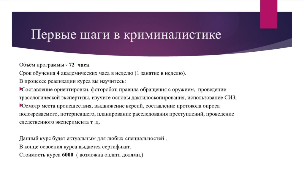 Объём программы - 72 часа Срок обучения 4 академических часа в неделю (1 занятие в неделю). В процессе реализации курса вы научитесь: Составление ориентировки, фоторобот, правила обращения с оружием, проведение трасологической экспертизы, изучите основы дактилоскопирования, использование СИЗ; Осмотр места происшествия, выдвижение версий, составление протокола опроса подозреваемого, потерпевшего, планирование расследования преступлений, проведение следственного эксперимента т.д. Данный курс будет актуальным для любых специальностей. В конце освоения курса выдается сертификат. Стоимость курса 6000 ( возможна оплата долями.) Первые шаги в криминалистике