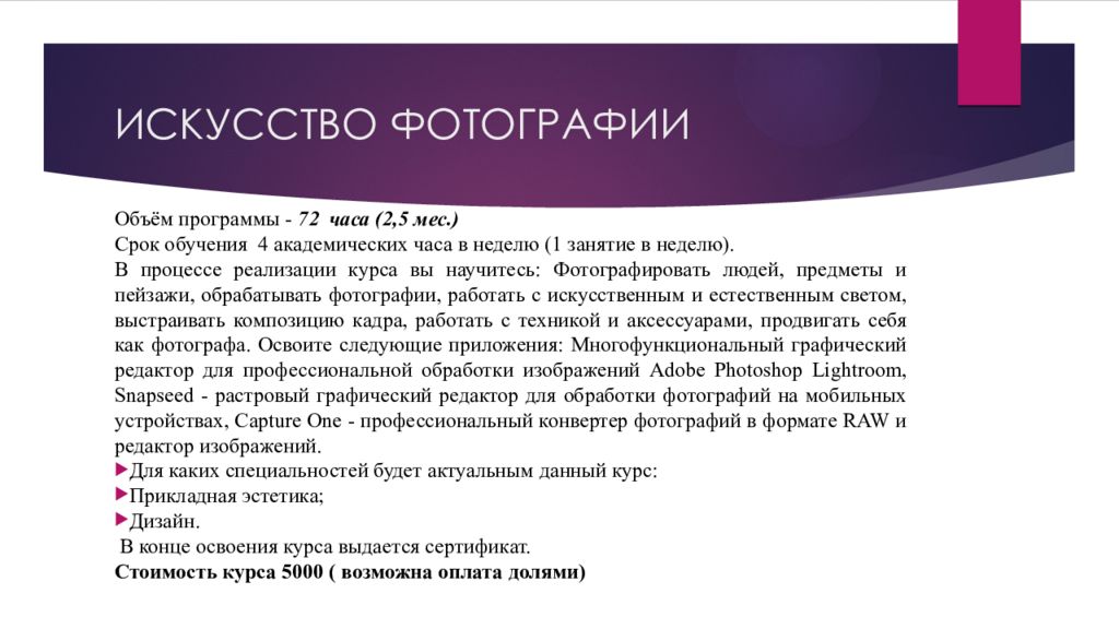 Объём программы - 72 часа (2,5 мес.) Срок обучения 4 академических часа в неделю (1 занятие в неделю). В процессе реализации курса вы научитесь: Фотографировать людей, предметы и пейзажи, обрабатывать фотографии, работать с искусственным и естественным светом, выстраивать композицию кадра, работать с техникой и аксессуарами, продвигать себя как фотографа. Освоите следующие приложения: Многофункциональный графический редактор для профессиональной обработки изображений Adobe Photoshop Lightroom, Snapseed - растровый графический редактор для обработки фотографий на мобильных устройствах, Capture One - профессиональный конвертер фотографий в формате RAW и редактор изображений. Для каких специальностей будет актуальным данный курс: Прикладная эстетика; Дизайн. В конце освоения курса выдается сертификат. Стоимость курса 5000 ( возможна оплата долями)