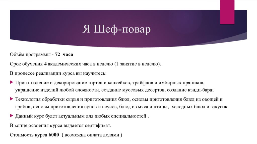 Объём программы - 72 часа Срок обучения 4 академических часа в неделю (1 занятие в неделю). В процессе реализации курса вы научитесь: Приготовление и декорирование тортов и капкейков, трайфлов и имбирных пряников, украшение изделий любой сложности, создание муссовых десертов, создание кэнди -бара; Технология обработки сырья и приготовления блюд, основы приготовления блюд из овощей и грибов, основы приготовления супов и соусов, блюд из мяса и птицы, холодных блюд и закусок Данный курс будет актуальным для любых специальностей. В конце освоения курса выдается сертификат. Стоимость курса 6000 ( возможна оплата долями.)