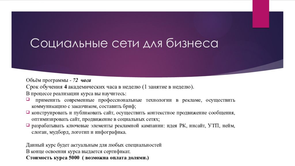 Объём программы - 72 часа Срок обучения 4 академических часа в неделю (1 занятие в неделю). В процессе реализации курса вы научитесь: применить современные профессиональные технологии в рекламе, осуществить коммуникацию с заказчиком, составить бриф; конструировать и публиковать сайт, осуществить контекстное продвижение сообщения, оптимизировать сайт, продвижение в социальных сетях; разрабатывать ключевые элементы рекламной кампании: идея РК, инсайт, УТП, нейм, слоган, мудборд, логотип и инфографика. Данный курс будет актуальным для любых специальностей В конце освоения курса выдается сертификат. Стоимость курса 5000 ( возможна оплата долями.)