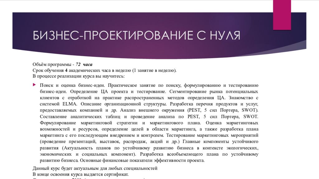 Объём программы - 72 часа Срок обучения 4 академических часа в неделю (1 занятие в неделю). В процессе реализации курса вы научитесь: Поиск и оценка бизнес-идеи. Практическое занятие по поиску, формулированию и тестированию бизнес-идеи. Определение ЦА проекта и тестирование. Сегментирование рынка потенциальных клиентов с отработкой на практике распространенных методов определения ЦА. Знакомство с системой ELMA. Описание организационной структуры. Разработка перечня продуктов и услуг, предоставляемых компанией и др. Анализ внешнего окружения (PEST, 5 сил Портера, SWOT). Составление аналитических таблиц и проведение анализа по PEST, 5 сил Портера, SWOT. Формулирование маркетинговой стратегии и маркетингового плана. Оценка маркетинговых возможностей и ресурсов, определение целей в области маркетинга, а также разработка плана маркетинга с его последующим внедрением и контролем. Тестирование маркетинговых мероприятий (проведение презентаций, выставок, распродаж, акций и др.) Главные компоненты устойчивого развития (Актуальность планов по устойчивому развитию бизнеса в контексте экологических, экономических и социальных компонент). Разработка всеобъемлющего плана по устойчивому развитию бизнеса. Основные финансовые показатели эффективности проекта. Данный курс будет актуальным для любых специальностей В конце освоения курса выдается сертификат. Стоимость курса 5000 ( возможна оплата долями.)