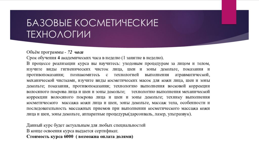 Объём программы - 72 часа Срок обучения 4 академических часа в неделю (1 занятие в неделю). В процессе реализации курса вы научитесь: уходовым процедурам за лицом и телом, изучите виды гигиенических чисток лица, шеи и зоны декольте, показания и противопоказания; познакомитесь с технологией выполнения атравматической, механической чистками, изучите виды косметических масок для кожи лица, шеи и зоны декольте; показания, противопоказания; технологию выполнения восковой коррекции волосяного покрова лица и шеи и зоны декольте; технологию выполнения механической коррекции волосяного покрова лица и шеи и зоны декольте; технику выполнения косметического массажа кожи лица и шеи, зоны декольте, массаж тела, особенности и последовательность массажных приемов при выполнении косметического массажа кожи лица и шеи, зоны декольте, аппаратные процедуры( дарсонваль, лазер, ультразвук). Данный курс будет актуальным для любых специальностей В конце освоения курса выдается сертификат. Стоимость курса 6000 ( возможна оплата долями)