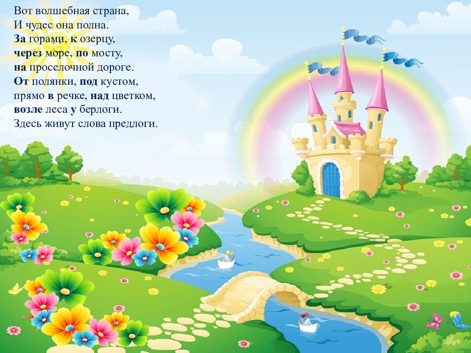 Вот волшебная страна, И чудес она полна. За горами, к озерцу, через море, по мосту, на проселочной дороге. От полянки, под кустом, прямо в речке, над цветком, возле леса у берлоги. Здесь живут слова предлоги.