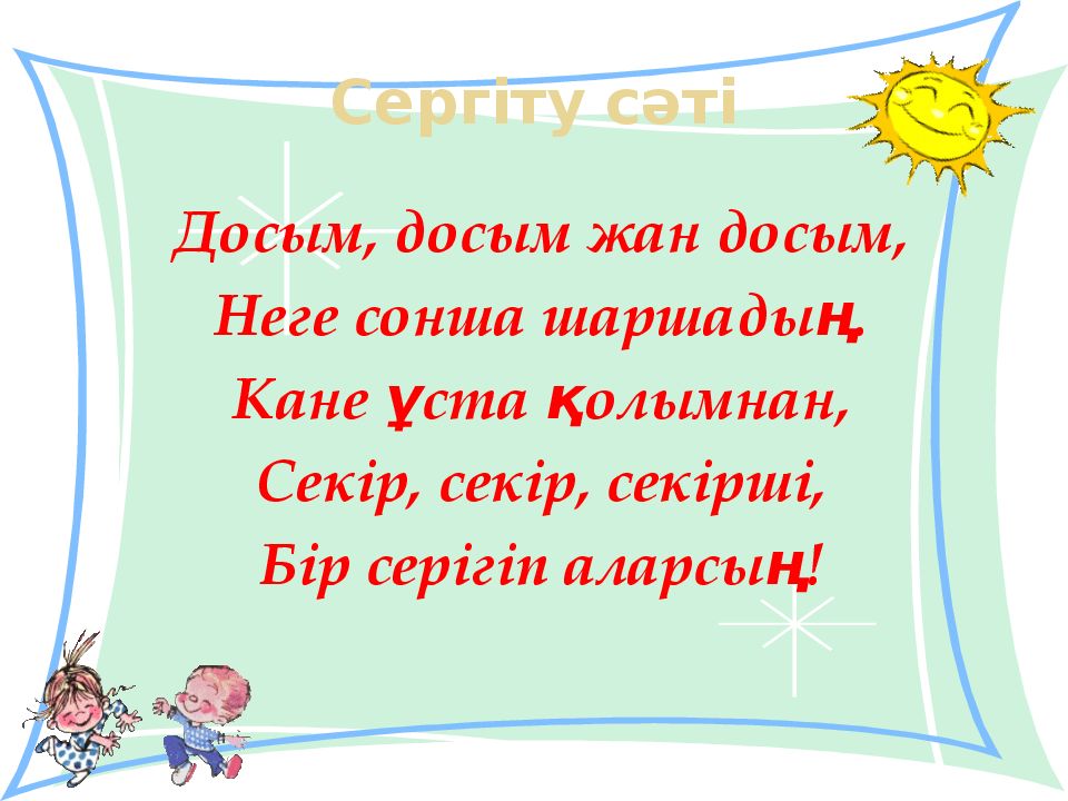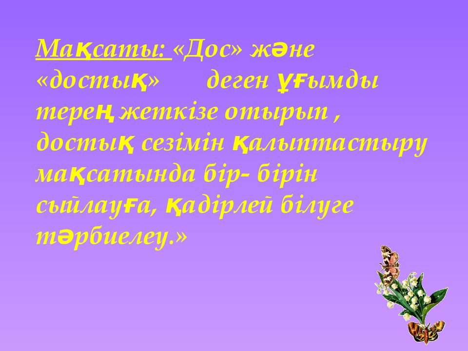 Мақсаты: «Дос» және «достық» деген ұғымды терең жеткізе отырып, достық сезімін қалыптастыру мақсатында бір- бірін сыйлауға, қадірлей білуге тәрбиелеу.»