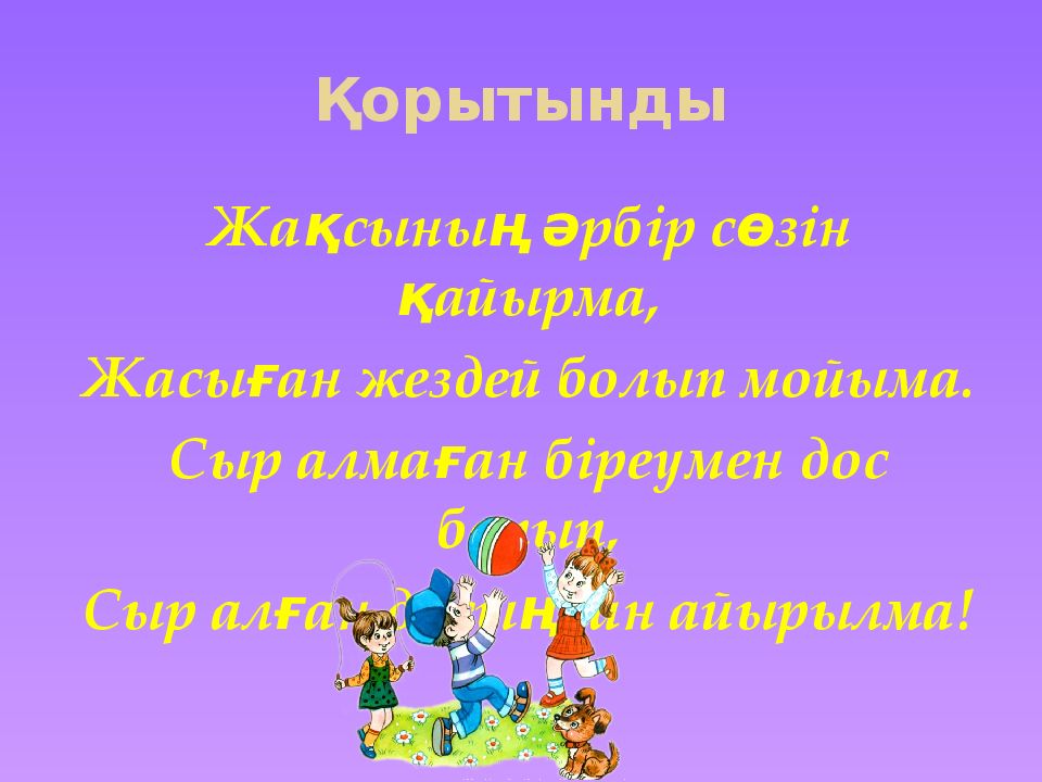 Слайд 3: Эпиграф: «Достық керек өмірде, Ашық сырлы көңілде. Дос жолдасың болмаса, Өмір сүру жеңіл ме?»