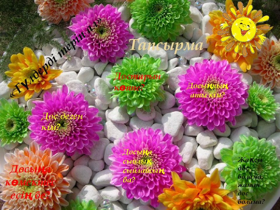 « Гүлдерді теріп ал» Досыңа көмектесесің бе? Достарын көппе? Дос деген кім? Досыңның аты кім? Жақсы дос болама, жаман дос болама? Досыңа сыйлық сыйлайсың ба?